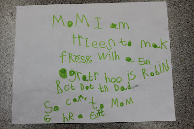 Dash has been doing some writing as well. Dash has a hard time falling asleep at night so he is allowed to draw in bed with a flashlight as long as he is quiet enough for Colt to fall asleep. Lately he has taken to writing notes and then presenting them to us the next morning. The following are some of my favorites along with a translation.