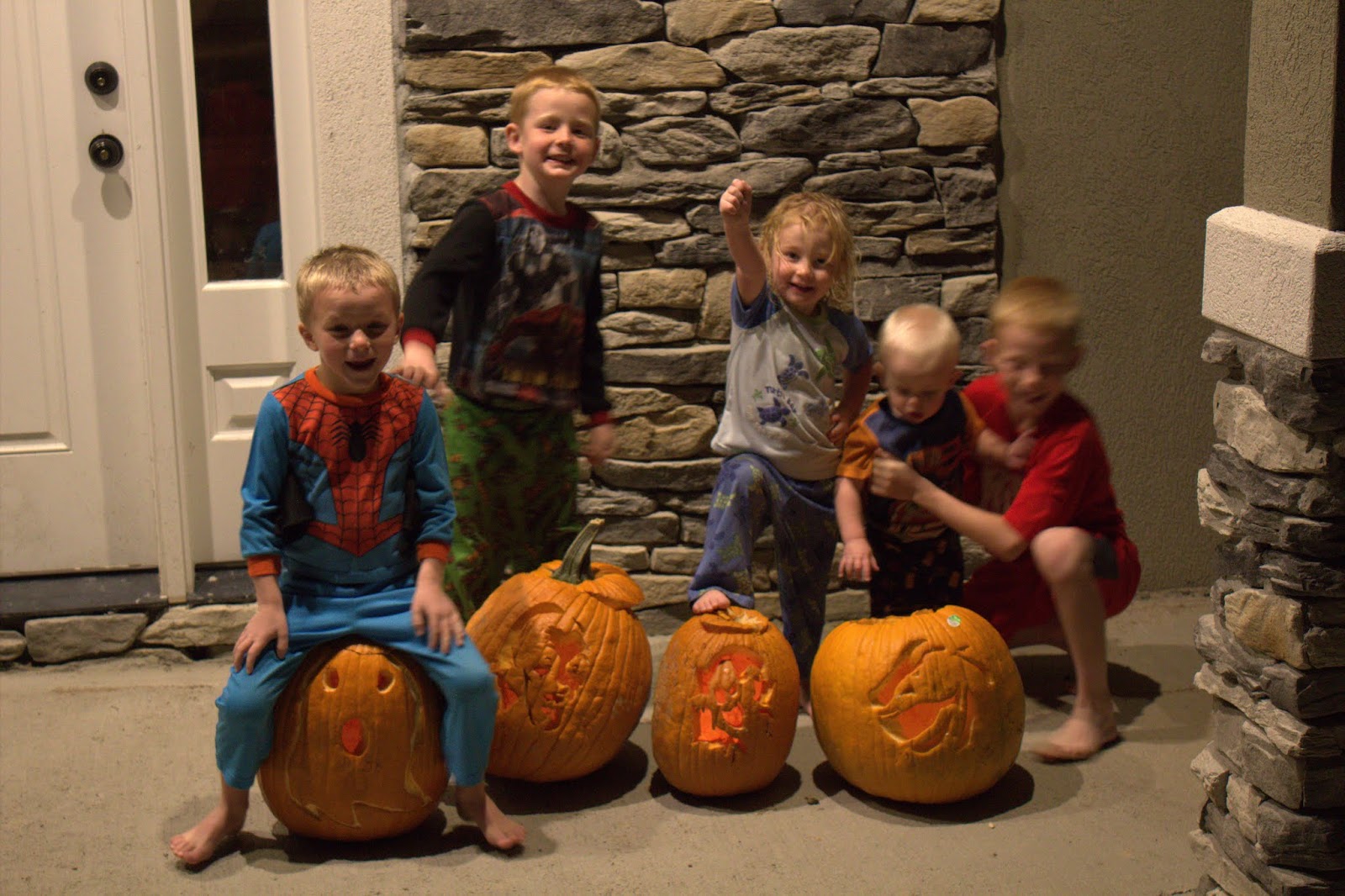 | All but Tag were up and dressed for trick-or-treating before the school bus arrived. |